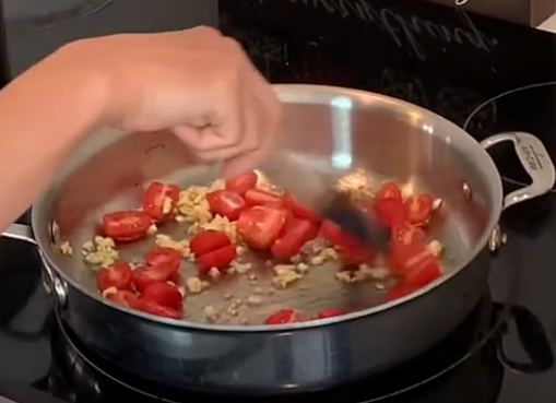 Once the garlic is nice and brown add in your tomatoes and add in a helping of salt to taste. Let it cook, stirring occasionally while ensuring the garlic does not burn on medium heat.