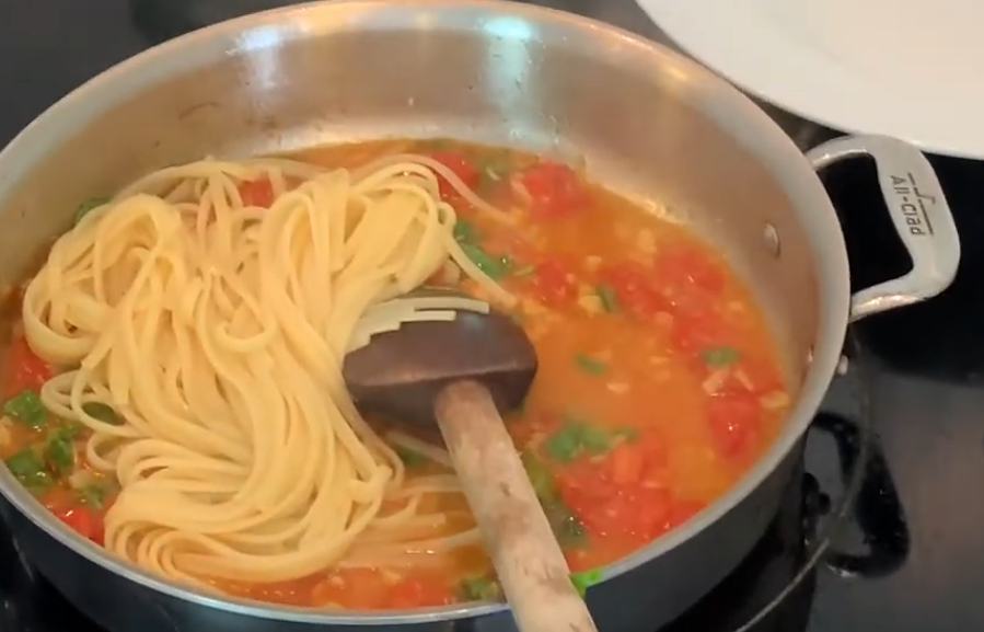 Add in basil and a little bit of pasta water to the pan and mix. Once the pasta is ready add that in as well and mix. (Do not drain pasta)
